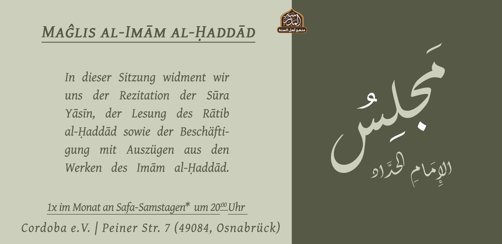 Wir laden herzlich zur Teilnahme an unserer Veranstaltungsreihe Maǧlis al-Imām al-Ḥaddād ein, die an "Safa-Samstagen"* um 20:00 Uhr im Cordoba e.V. (Peiner Str. 7, 49084 Osnabrück) stattfinden wird. Erste Sitzung: Samstag, 21. Juni 2025, um 20:00 Uhr *Das sind die Samstage, an denen die Safa-Kurse stattfinden. Die aktuellen Termine befinden sich unten. In diesen Sitzungen […]