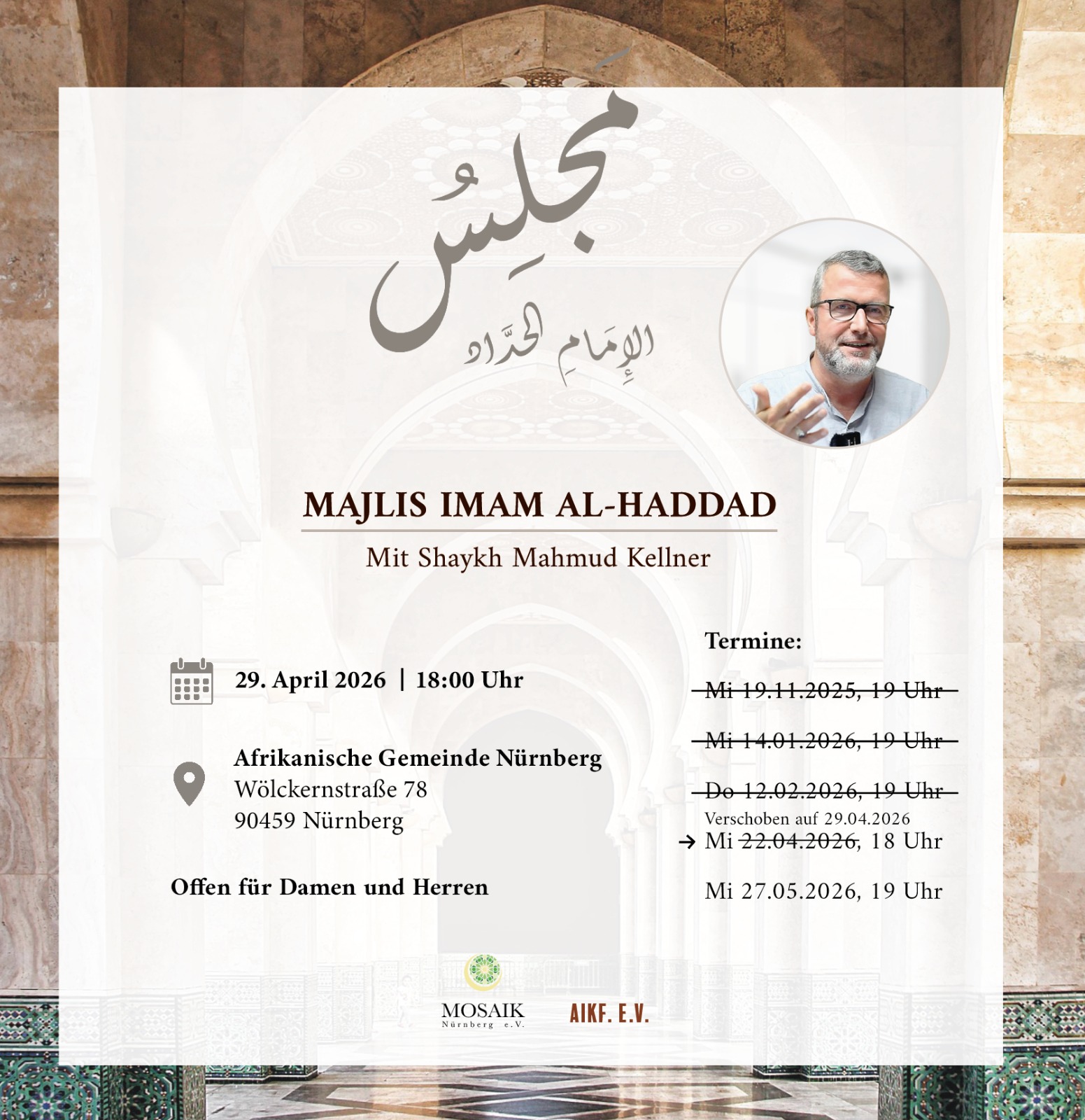 verschoben auf den 29.4.26 MAJLIS IMAM AL-HADDAD Mit Ustadh Dr. Mahmud Kellner 29. April 2026 | 18:00 Uhr Afrikanische Gemeinde Nürnberg Wölkernstraße 78 90459 Nürnberg Offen für Damen und Herren […]
