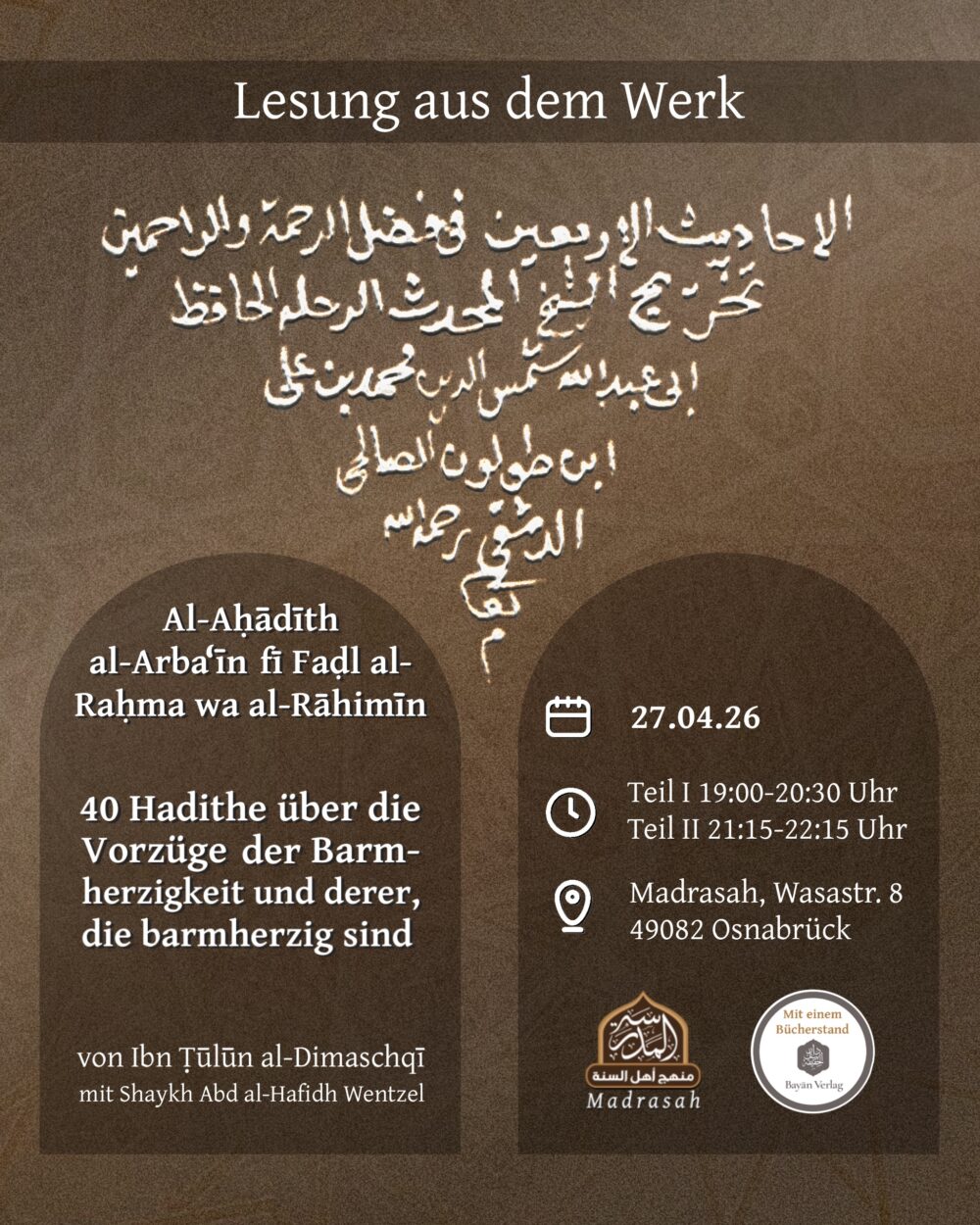 As-Salāmu ʿalaikum wa raḥmatullāh, Lesung aus „40 Ḥadīthe über die Vorzüge der Barmherzigkeit und derer, die barmherzig sind“ von Ibn Ṭūlūn al-Dimaschqī mit Shaykh Abdal al-Hafidh Wentzel in Osnabrück. Alle […]