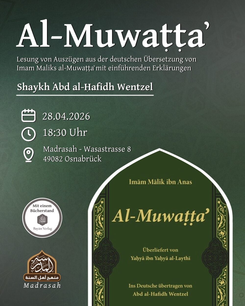 As-Salāmu ʿalaikum wa raḥmatullāh, Eine Lesung aus der al-Muwaṭṭaʾ von Imam Mālik mit Shaykh Abdal al-Hafidh Wentzel in Osnabrück. Alle weiteren Informationen findet ihr auf dem Flyer. Vor Ort wird […]